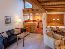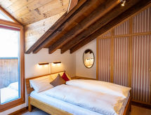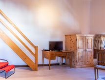 RéférenceChesa Cantieni, 3-room apartment 85 m2 on 2 levels, north facing position. Comfortable and tasteful furnishings: living/dining room with open-hearth fireplace and TV. 1 room with 1 bed (90 cm, length 200 cm), 1 x 2 bunk beds (85 cm, length 185 cm). Open kitchen (oven, dishwasher, 4 induction hot plates, toaster, kettle, freezer, electric coffee machine, Capsules for coffee machine (Nespresso) extra, raclette grill). Shower/WC. Upper floor: 1 room with 1 double bed (2 x 80 cm, length 195 cm), bath/shower/WC. Exit to the balcony. Gallery with 1 sofabed (150 cm, length 200 cm). Small balcony. View of the resort. Facilities: hair dryer. Internet (WiFi, free). Garage space n 12 at 100 m, height 225 cm, width 260 cm. Please note: suitable for families. Non-smokers only. Instead of an enclosed bedroom, some sleeping areas are located in an open-plan area (gallery, alcove, etc.).
